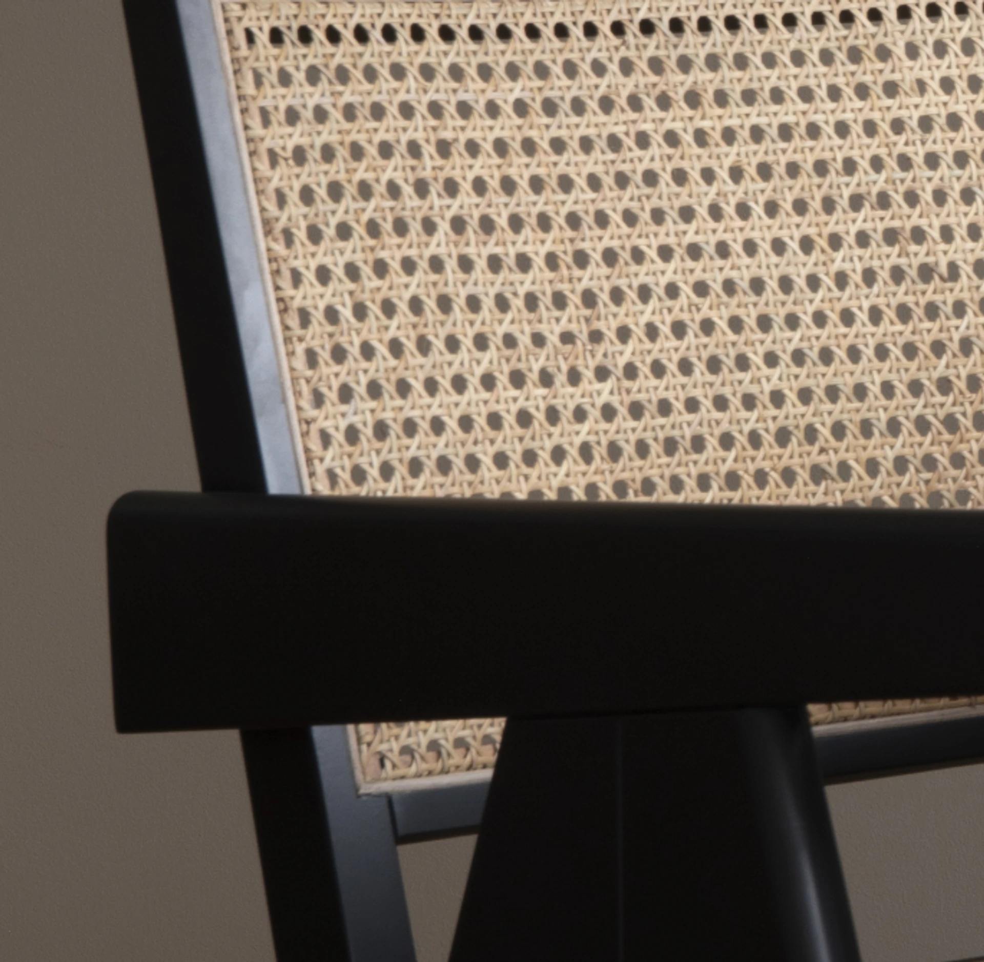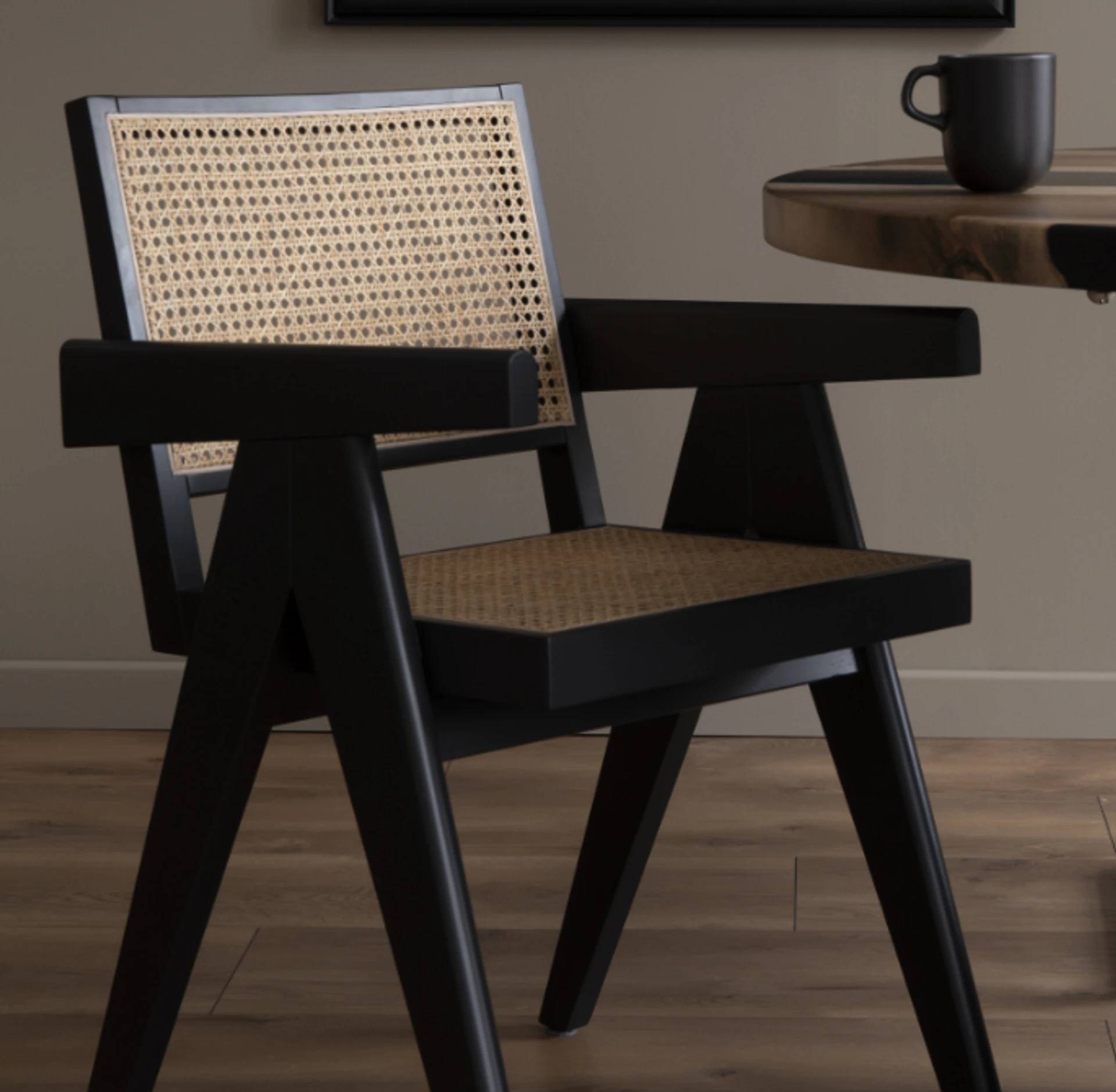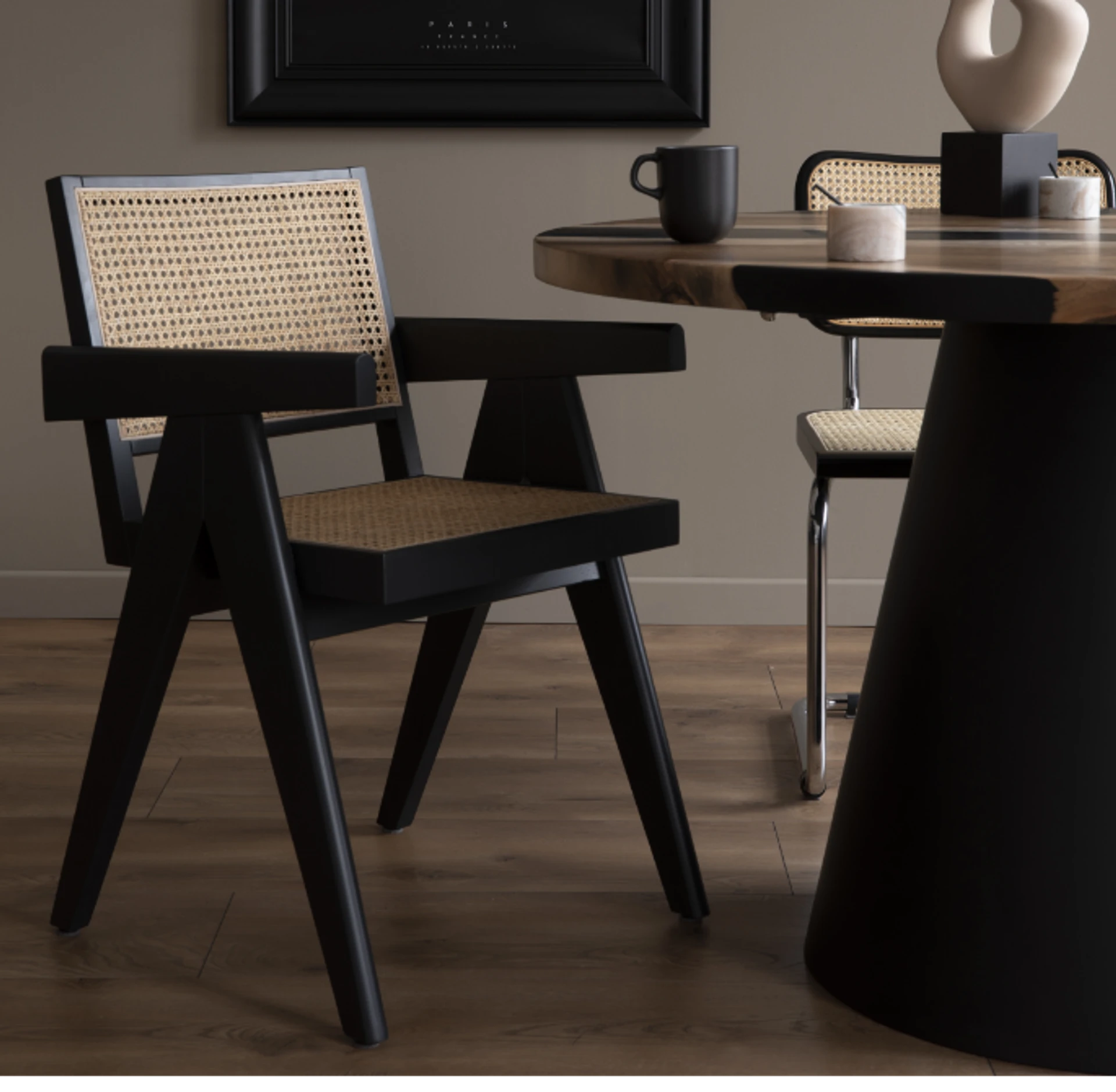 La chaise Lina combine la sobriété du bois noir avec la légèreté du cannage naturel, offrant une allure à la fois moderne et intemporelle. Son design minimaliste en fait une pièce versatile, s'intégrant parfaitement à différents styles d'intérieur. L'assise, pensée pour un confort prolongé, est idéale aussi bien autour d'une table à manger que comme fauteuil d'appoint dans un salon ou un bureau.