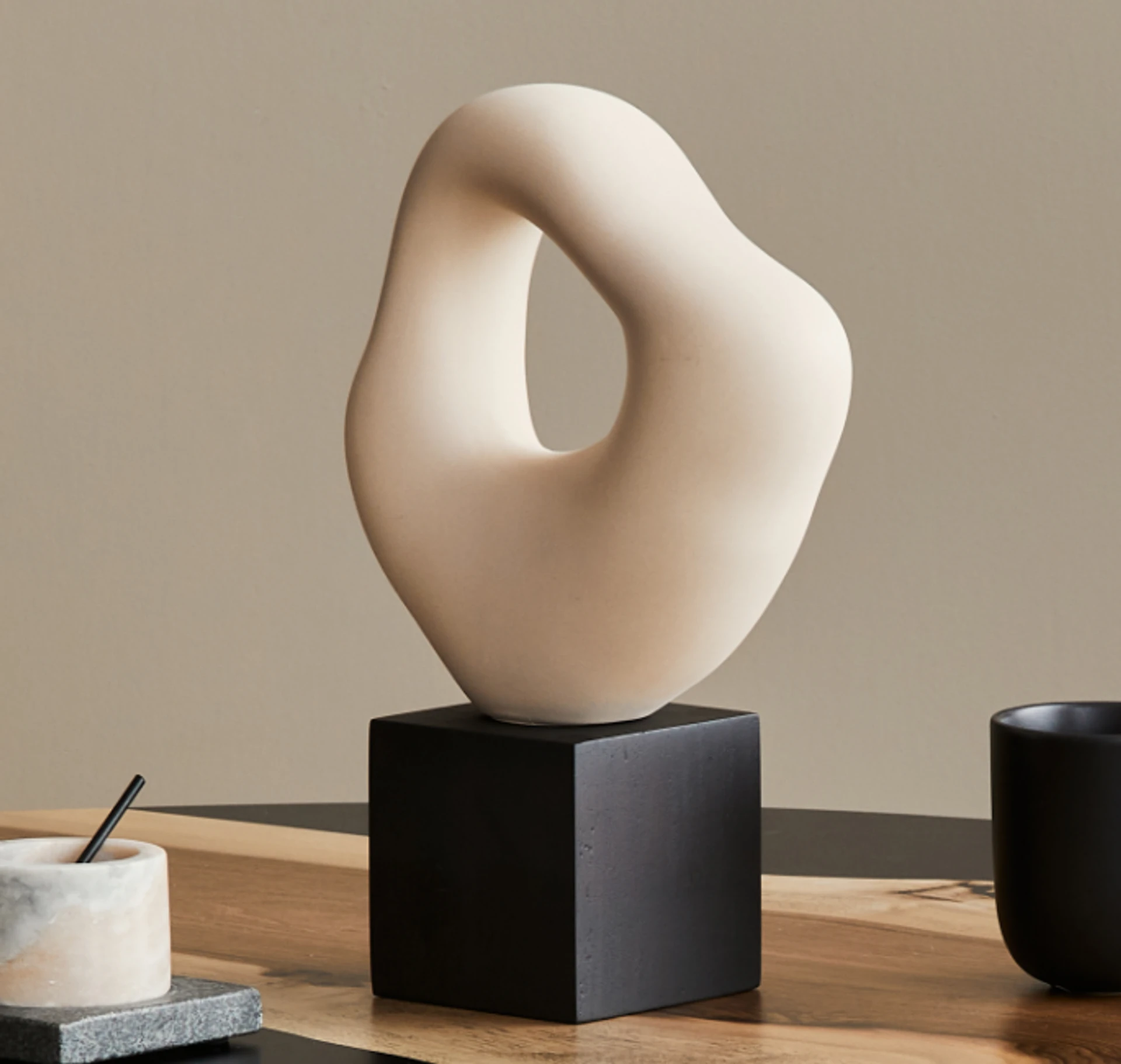 Avec sa silhouette épurée et sa forme tout en courbes, la sculpture Mona incarne l’équilibre entre matière brute et finesse du geste. Son volume doux et abstrait attire le regard sans jamais dominer l’espace. Montée sur un cube de bois noir qui contraste subtilement avec le beige mat de la sculpture, elle devient un accent décoratif à la fois contemporain et poétique. Parfaite seule ou associée à d’autres objets sculpturaux pour créer un jeu de volumes.